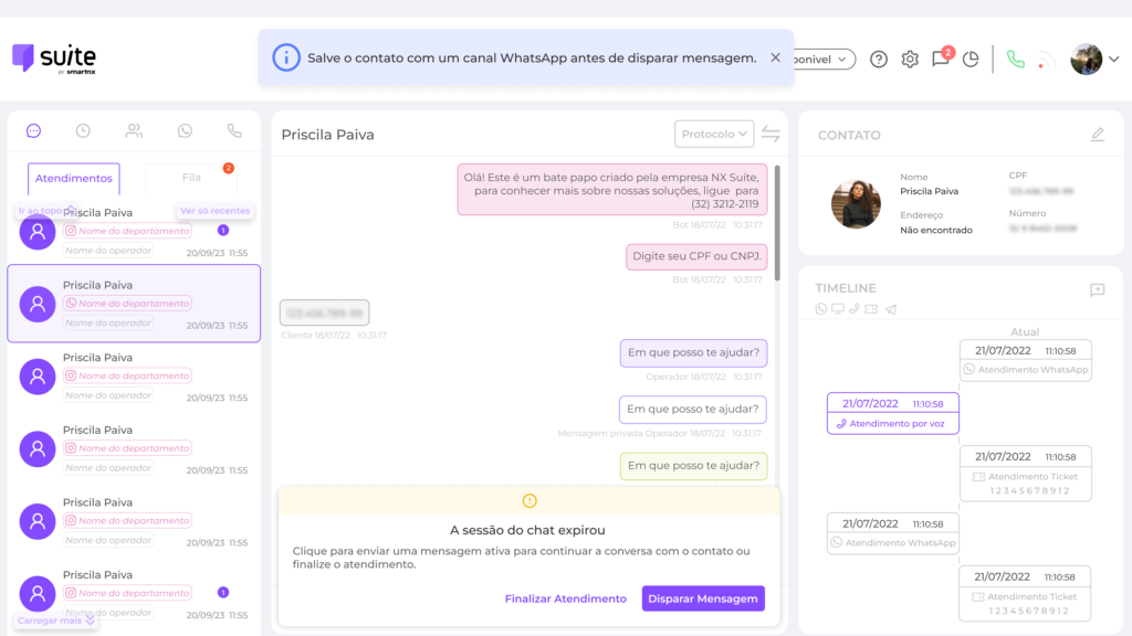 2.4 Se o cliente responder após a expiração da sessão de 24 horas, o aviso desaparece, permitindo ao operador enviar mensagens novamente.