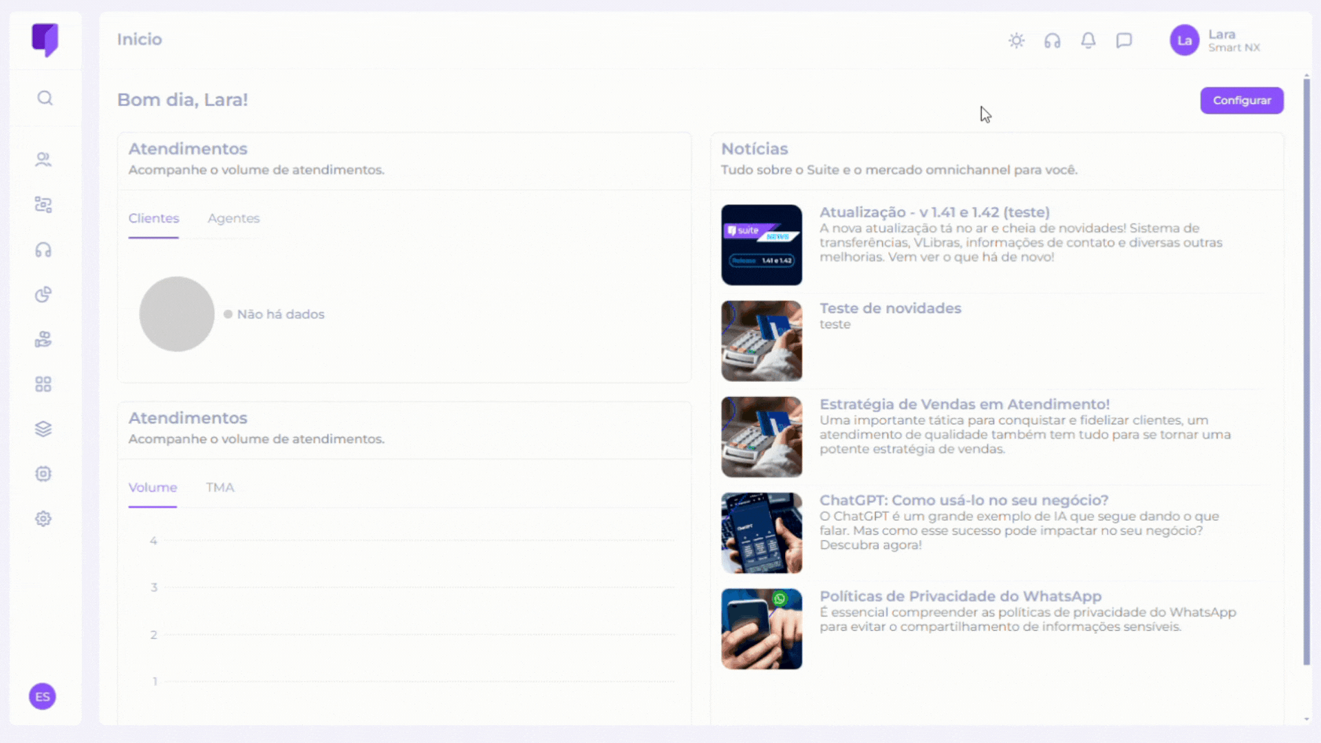 2.1. Com o lançamento da V2 do SUITE, transformamos o design e a usabilidade do sistema. A interface foi renovada para proporcionar uma experiência mais intuitiva e agradável, com um visual mais leve e funcional. Dentre as mudanças, destaca-se: